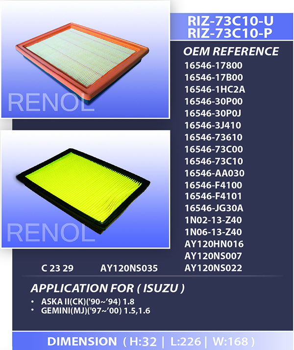 AIR ISUZU=RIZ-73C10-U 16546-17800 16546-17B00 16546-1HC2A 16546-30P00 16546-30P0J 16546-3J410 16546-73610 16546-73C00 16546-73C10 16546-AA030 16546-F4100 16546-F4101 16546-JG30A 1N02-13-Z40 1N06-13-Z40 AY120HN016 AY120NS007 AY120NS022 AY120NS035 C2329 ASKA GEMINI