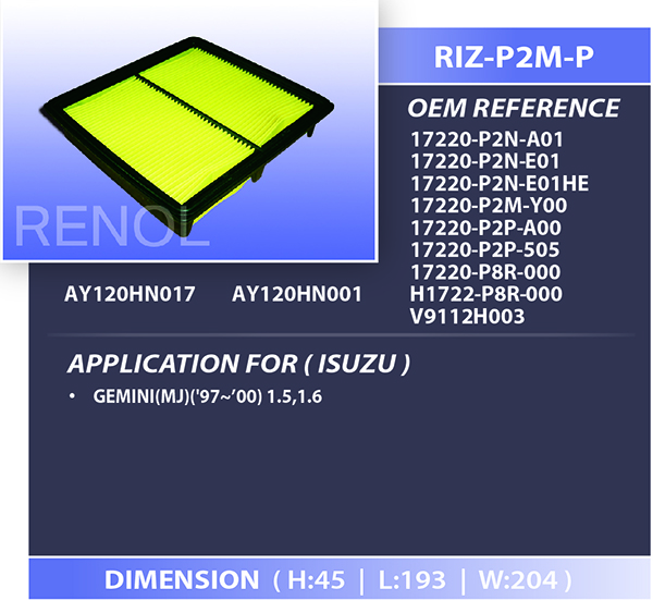 AIR ISUZU=RIZ-P2M-P 17220-P2M-Y00 17220-P2N-A01 17220-P2N-E01 17220-P2N-E01HE 17220-P2P-A00 17220-P2P-505 17220-P8R-000 H1722-P8R-000 V9112H003 AY120HN001 AY120HN017 GEMINI