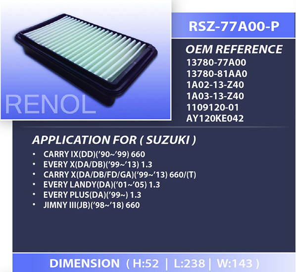 AIR SUZUKI=RSZ-77A00-P 13780-77A00 13780-81AA0 1A02-13-Z40 1A03-13-Z40 1109120-01 AY120KE042 CARRY EVERY LANDY PLUS JIMNY
