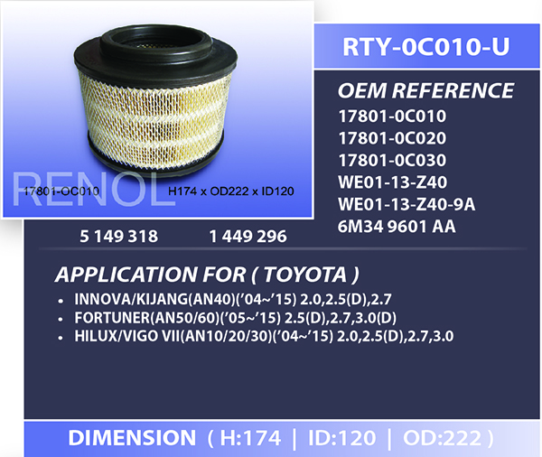 • AIR TOYOTA=RTY-0C010-U 17801-0C010 17801-0C020 17801-0C030 WE01-13-Z40 WE01-13-Z40-9A 6M349601AA 5149318 1449296 INNOVA KIJANG FORTUNER HILUX VIGO