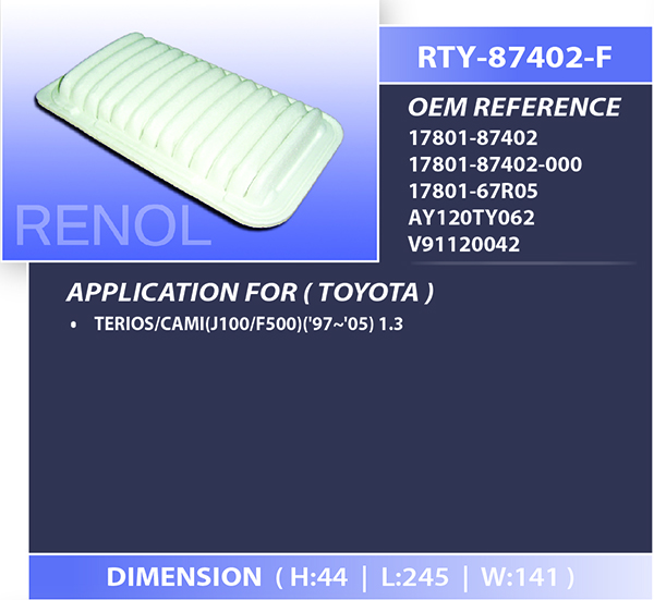 • AIR TOYOTA=RTY-87402-F 17801-87402 17801-87402-000 17801-67R05 AY120TY062 V91120042 TERIOS CAMI