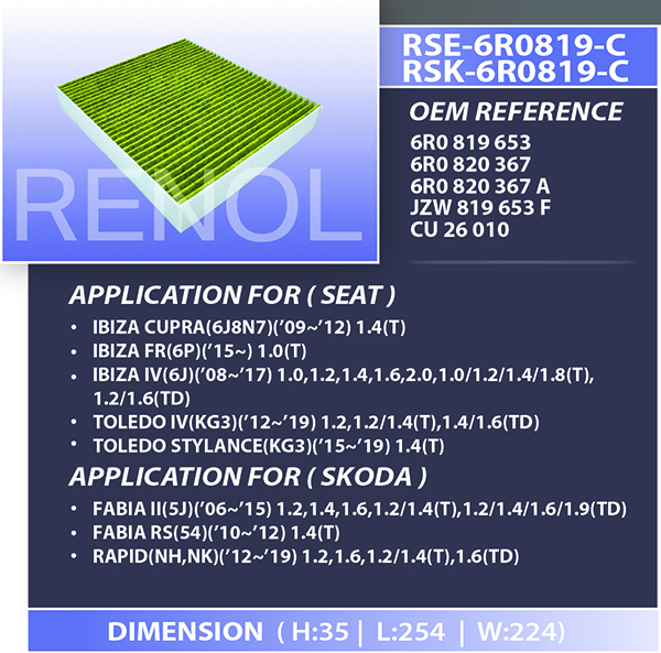 CABIN SEAT SKODA=RSK-6R0819-C RSE-6R0819-C 6R0819653 6R0820367 6R0820367A JZW819653F CU26010 IBIZA CUPRA FR TOLEDO STYLANCE FABIA RA RAPID