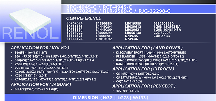 CABIN VOLVO LAND ROVER CITROEN PEUGEOT JAGUAR=RVO-7024-C RLR-9589-C RJG-32298-C RPG-4945-C RCT-4945-C 30767024 30733893 30733894 30767022 31366123 31366124 31390880 31449204 31449209 LR000899 LR000901 LR019192 LR019589 LR039612 LR039621 LR056138 6749.45 6749.46 9682603680 6G9N180543BA 6G9N19N619BA C2Z32298 CUK2733 C5 ESTATE C6 E-PACE DISCOVERY SPORT FREELANDER RANGE ROVER EVOQUE 407 S60 S80 V60 V70 XC60 XC70