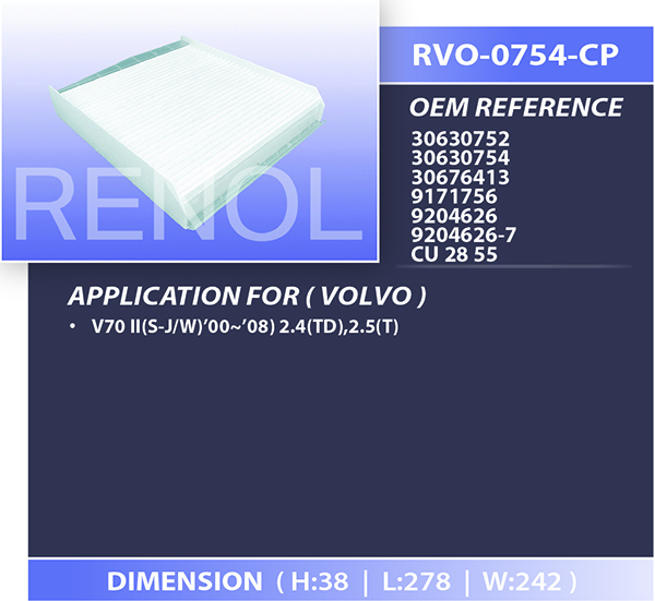 CABIN VOLVO=RVO-0754-CP 30630752 30630754 30676413 9171756 9204626 9204626-7 CU2855 V70