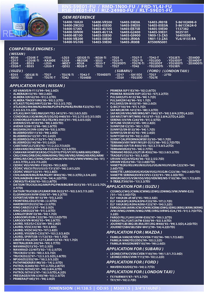 FUEL NISSAN SUBARU ISUZU MAZDA FORD=RNS-59E01-FU RLT-59E01-FU RIZ-24980-FU RFD-YL4J-FURMD-1N00-FU RSB-59E01-FU 16400-18A20 16400-2W202 16400-57J05 16400-58N00 16400-8E100 16400-VB200 16400-VG100 16400-VR500 16403-05E00 16403-4U105 16403-4U11A 16403-50E00 16403-58E00 16403-59E00 16403-59E0A 16403-59EX0 16403-EB75B 16403-G2400 16403-G9900 16403-JR00A 16403-JR00B 16403-JR01B 16405-05E0A 16405-59E00 16405-59E01 1N00-13-ZA5 1N01-13-ZA5 AY500NS001 5-86102498-0 5-86133624-0 1137382 5025101 16405050 YL4J9155BA LEONE MAVERICK FAMILIA VAN WAGON COMO ELF100 FARGO FILLY JOURNEY FX FAIRWAY TX I AD VAN ALMERA TINO ATLAS CONDOR AVENIR BASSARA BLUEBIRD CABSTAR CARAVAN HOMY CEDRIC CIVILIAN CREW DATSUN TRUCK ELGRAND EXPERT FRONTIER HARDBODY KING CAB LANGLEY LARGO LAUREL SPIRIT VILLA MISTRAL NAVARA NISSAN TRUCK NP300 PATHFINDER PATROL PICKUP PRESAGE PRIMERA WAGON PULSAR Q-BIC SAFARI SERENA SKYLINE SUNNY CALIFORNIA TERRANO REGULUS TRADE URVAN VANETTE WINGROAD X-TRAIL