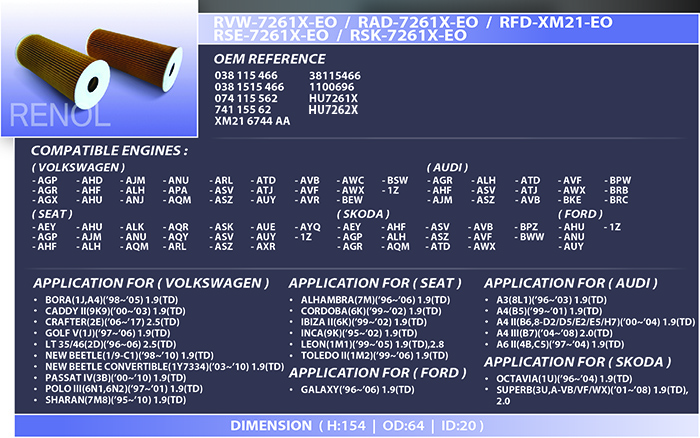 OIL AUDI VOLKSWAGEN SKODA SEAT FORD=RVW-7261X-EO RAD-7261X-EO RFD-XM21-EO RSK-7261X-EO RSE-7261X-EO 074115562 038115466 0381515466 38115466 74115562 XM216744AA 1100696 HU7261X hu7262x A3 A4 A6 GALAXY ALHAMBRA CORDOBA IBIZA INCA LEON TOLEDO OCTAVIA SUPERB BORA CADDY CRAFTER GOLF LT35 LT46 NEW BEETLE CONVERTIBLE PASSAT POLO SHARAN
