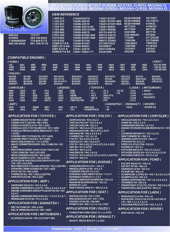 OIL FORD VOLVO TOYOTA DODGE CHRYSLER MITSUBISHI DAIHATSU JEEP RENAULT ROVER SEAT LADA ISUZU=RFD-MO090-O RJP-MO090-O RDG-MO090-O RSE-MO090-O RCR-MO090-O RRN-MO090-O RRV-MO090-O RLD-MO090-O RMB-353795-O RIZ-87307-O RTY-87307-O RDH-87307-O 1498021 1526270 1555451 1564767 1565486 5000860 5003560 5010665 5014055 C5NN6714B D8PJ6714AA DIRY6731A E4NN6714AA J1560025010 15600-20550 15600-25010 15600-25010-83 15600-25010-000 15600-64010 15600-87305-000 15600-87307-000 15600-87104 15600-87307 15600-96001 15601-25010 15601-78001-71 15601-87307 15601-87307-000 15601-87307-99A 15601-96001 15601-96006 04152-64010 90915-25010 90915-40001 90915-TD003 AY100TY023 03549957 05013780AA 05281090 05281090AB 05281090BA 05281090BB 4417559 4417560 5281090 5281090AA 110200 1266286 12662862 1266388 1555451 266286 3517857 35178573 418432 4184321 807180 807719 872683 01125224 93156669 7984235 4126435 650367 650385 800334 834940 11609060300 0003938626 173171 5001846635 7700640175 0011844725 DELTA WIDE COMO ECLIPSE MGR V8 MAXITY TRUCK RVI CHEROKEE GRAND WRANGLER NIVA NOVA TOSCANA IBIZA MALAGA PANDA RITMO AVANGER BREEZA CHARGER DURANGO GRAND CARAVAN MAGNUM NITRO RAM 1500 ESCORT GRANADA PICKUP SCORPIO SIERRA SAPPHIRE TOURNEO TRANSIT CARINA COROLLA TERCEL CORSA CORONA HIACE COMMUTER REGIUS VAN HILUX LITEACE MASTERACE SPRINTER CARIB STOUT TOWNACE VAN 300C 300M COMMANDER GRAND VOYAGER LE BARON SEDAN NEW YORKER SEBRING STRATUS VIPER VISION VOYAGER 240 740 760 850 940 960 C30 C70 S40 S70 S80 S90 V40 V70 V90