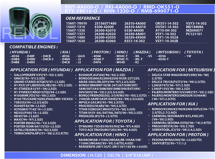 OIL HYUNDAI KIA TOYOTA HINO PROTON MITSUBISHI MAZDA=RHY-4A000-O RKI-4A000-O RMD-OK551-O RTY-78010-O RHN-1330-O RMB-690071-O 26310-4A000 26310-4A010 26300-42000 26300-42010 26300-42030 26300-42060 26300-42020 26330-4X000 26330-4A001 26330-4A000 K551-14-302 OK551-14-302 OVS01-14-302 MD184086 MZ690071 PC121101 AY10-0H-D503 VSY1-14-302 VSY1-14-302A VSY1-14-302B VSY3-14-302 15601-78010 15607-1310 15607-1330 15607-1331 15607-1480 15607-1630 S156071480 RAINBOW RANGER PERSONA WIRA SAVVY DYNA TOYO ACE TRUCK SATELLITE TERRACAN GALLOPER GRACE GRAND STAREX H1 PICK UP STAREX CARGO H100 H200 H350 HD35 HD45 MAXI PORTER BONGO K2500 K2700 K2900 CARNIVAL SEDONA PREGIO BESTA SORENTO B2500 E2000 E2200 E2500 BRAWNY FRIENDEE J100 MPV PROCEED TITAN FREDA DELICA STAR WAGON L200 L300 PAJERO MONTERO SHOGUN