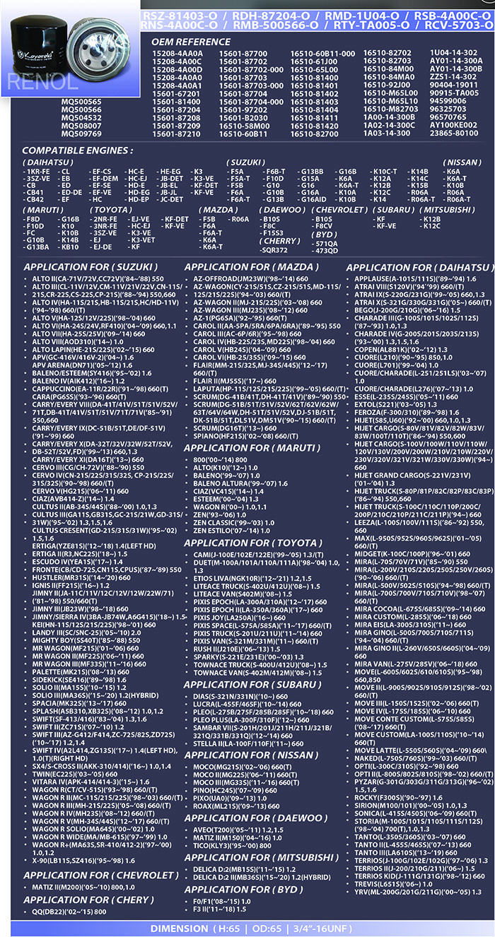 OIL SUZUKI MARUTI TOYOTA DAIHATSU CHEVROLET CHERY BYD DAEWOO SUBARU NISSAN MITSUBISHI MAZDA=RSZ-81403-O RDH-87402-O RMD-1U04-O RSB-4A00C-O RNS-4A00C-O RMB-500566-O RTY-TA005-O RCV-5703-O 15208-4AA0A 15208-4A00C 15208-4A00D 15208-4A0A0 15208-4A0A1 15601-67201 15601-81400 15601-87204 15601-87208 15601-87209 15601-87210 15601-87700 15601-87702 15601-87702-000 15601-87703 15601-87703-000 15601-87704 15601-87704-000 15601-97202 15601-B2030 16510-58M00 16510-60B11 16510-60B11-000 16510-61J00 16510-65L00 16510-81400 16510-81401 16510-81402 16510-81403 16510-81404 16510-81411 16510-81420 16510-82700 16510-82702 16510-82703 16510-84M00 16510-84MA0 16510-92J00 16510-M65L00 16510-M65L10 16510-M82703 1A00-14-300B 1A02-14-300C 1A03-14-300 1U04-14-302 AY01-14-300A AY01-14-300B ZZS1-14-302 90404-19011 90915-TA005 94599006 96325703 96570765 AY100KE002 23865-80100 MQ500565 MQ500566 MQ504532 MQ508007 MQ509769 F0 F1 F3 QQ MATIZ AVEO TICO DELICA D:2 DIAS LUCRA PLEO PLUS SAMBAR STELLA MOCO PINO PIXO ROAX AZ-OFFROAD AZ-WAGON AZ-1 CAROL FLAIR LAPUTA SCRUM SPIANO CAMI DUET ETIOS LIVA LITEACE TRUCK VAN PIXIS EPOCH JOY SPACE TRUCK VAN RUSH SPARKY TOWNACE APPLAUSE ATRAI BEGO CHARADE COPEN CUORE ESSE EXTOL FEROZA HIJET CARGO TERRIOS KID TREVIS YRV MINI VAN PORTER GRAND CARGO LEEZA MAX MIDGET MIRA COCOA CUSTOM EIS GINO MOVE CONTE CUSTOM LATTE NAKED OPTI PYZAR ROCKY SIRION SONICA STORIA TANTO 800 ALTO BALENO ALTURA CIAZ ESTEEM WAGON R ZEN CLASSIC ESTILO CULTUS CRESCENT ERTIGA ESCUDO FRONTE HUSTLER IGNIS JIMNY SIERRA KEI LANDY MIGHTY BO LAPIN APV ARENA CAPPUCCINO CARA EVERY CERVO MR WAGON PALETTE SIDEKICK SOLIO SPACIA SPLASH SWIFT SX4 S-CROSS TWIN VITARA WIDE R+ X-90